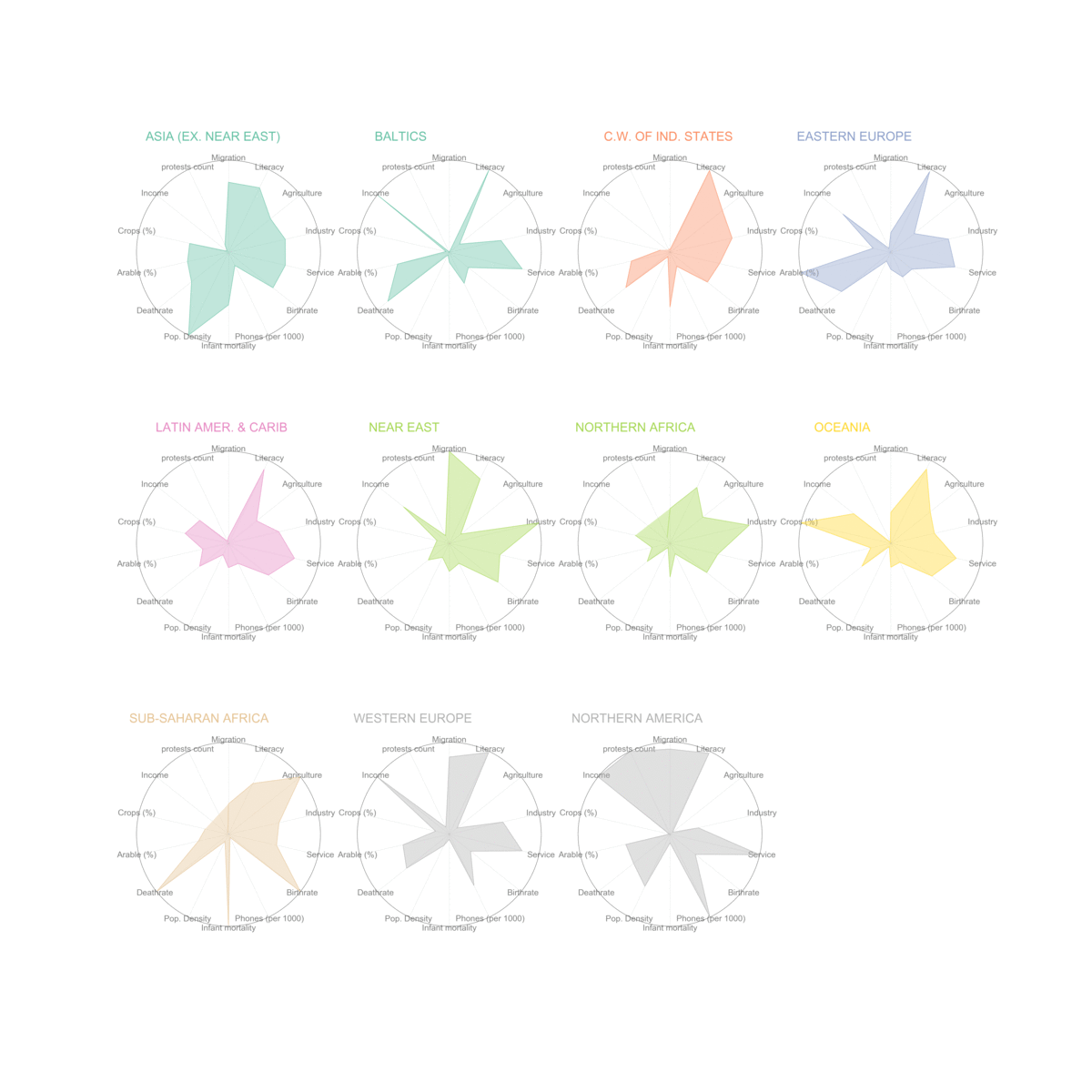 We wanted to find a way to visualize all the countries’ statistics with the protests’ count. The objective was to visualy find correlations between statistics and number of protests. We choose to visualize by region instead of country. The most relevant visualization was the following one: