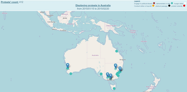 We can see, for the US and Australia, that the protest are mainly located on the East cost.