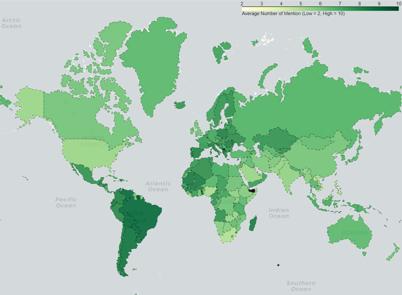 The wealth of a country’s economy is maybe not the only indicator to look at. The world of protests seems to be a bit more complicated. India is the second country with the most protests. Nevertheless, in occidental country, we don’t hear about all of these protests. We thus decided to compare the visibility of the countries’ protests on the news. We displayed the average number of mentions per country for their protests.