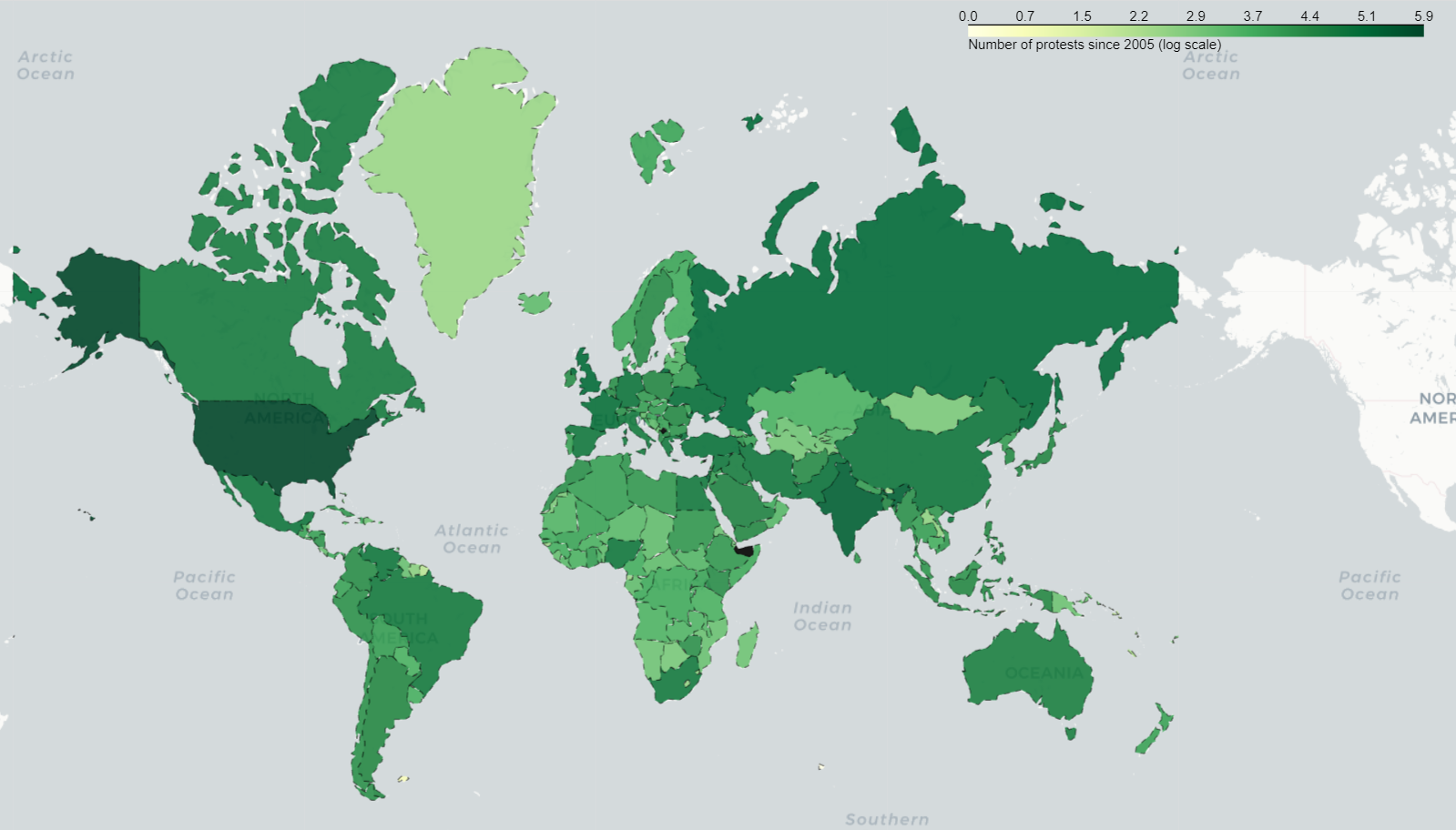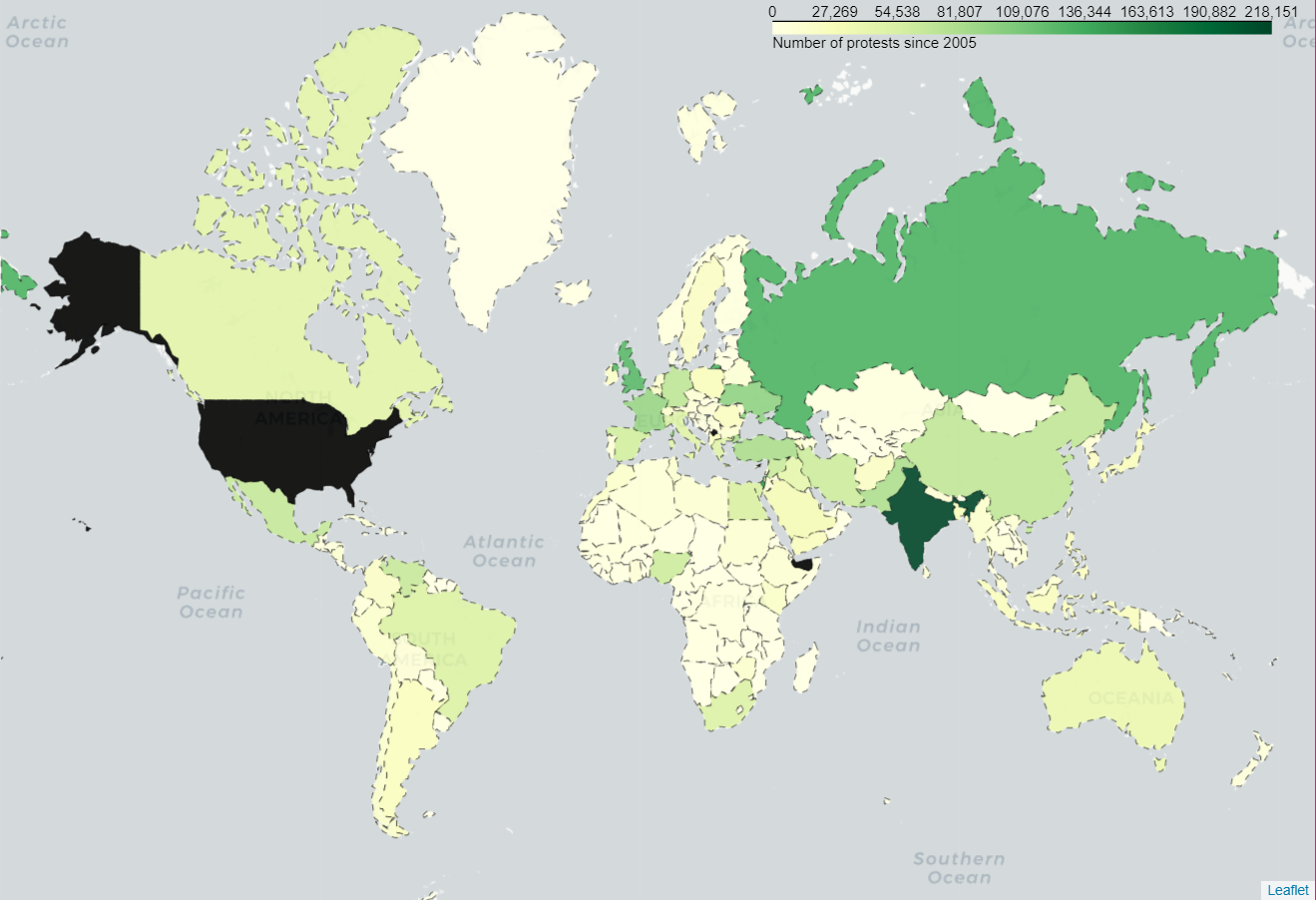 Despite having the US in black, this map brings much more information about the distribution of protests. India, Russia and United Kingdom have the highest count. There are almost no protests in Africa that is the poorest continent (maybe the information is not recorded in our database), but there are also only few protests in Scandinavian country which are rich countries.