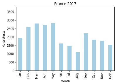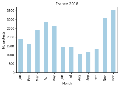 A very good example of this unpredictability of a spike in number of protests is the Arab spring (sadly the data did not contain this period). This movement has taken the world by surprise and of course after hand, we can see indicators telling us that a revolution was probable, but they are no reason why it happened at that time and not six months before or after. Another example is the jellow jacket movement in France, really who could have predicted that this small tax increase would have created such a backslash. At least we know that the French government did not predict it, they wouldn’t have done it otherwise. The number of protest in France is compared bellow between the years 2017 & 2018.