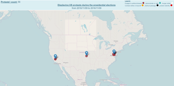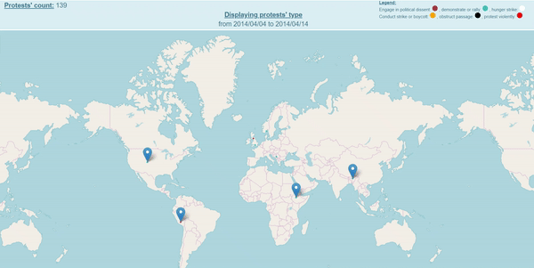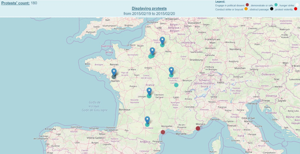 As we have the location and the type of each protest, we wanted to visualize it on animated maps. These maps will show how the protests are shared and how they progress within a period.