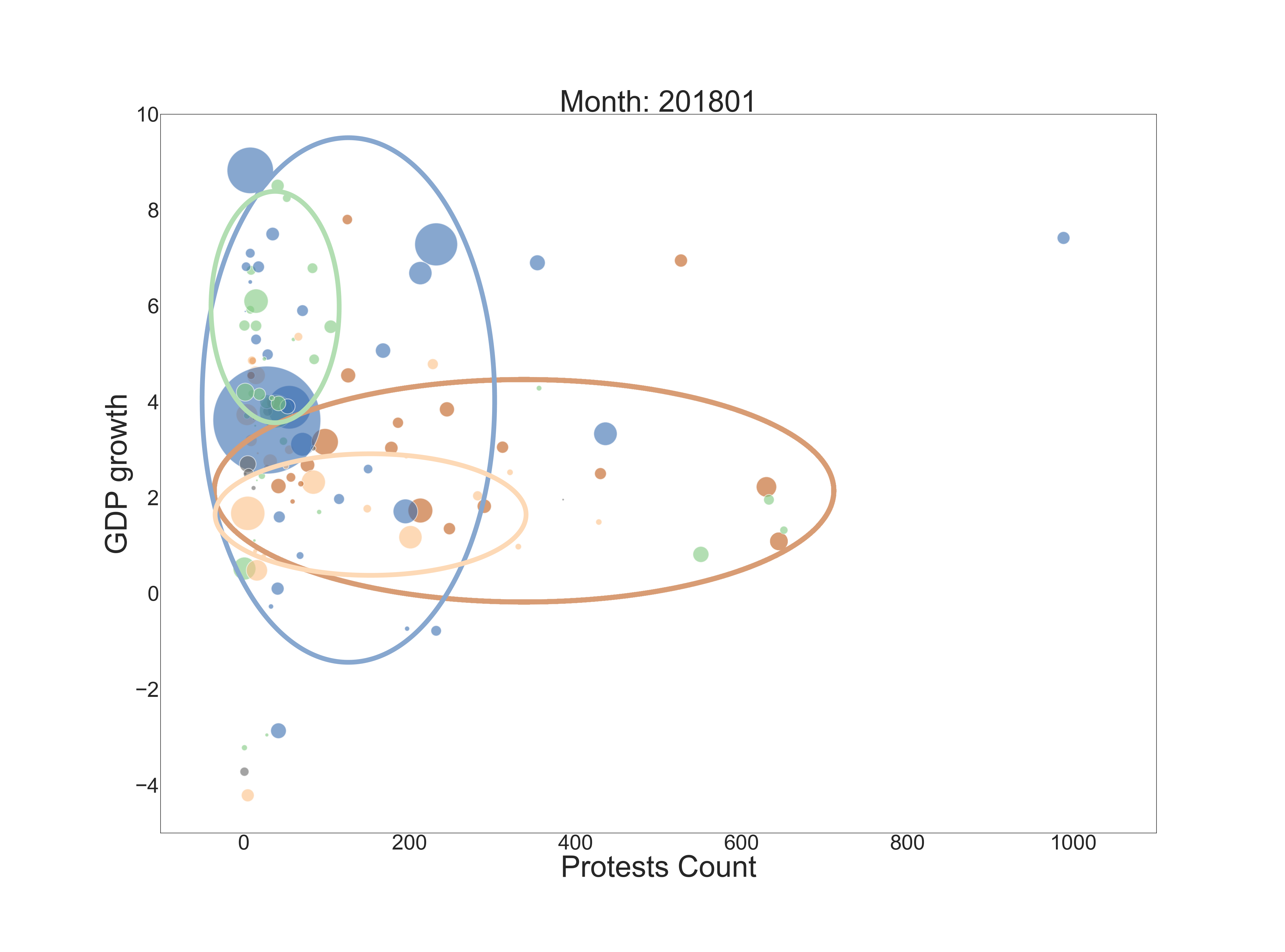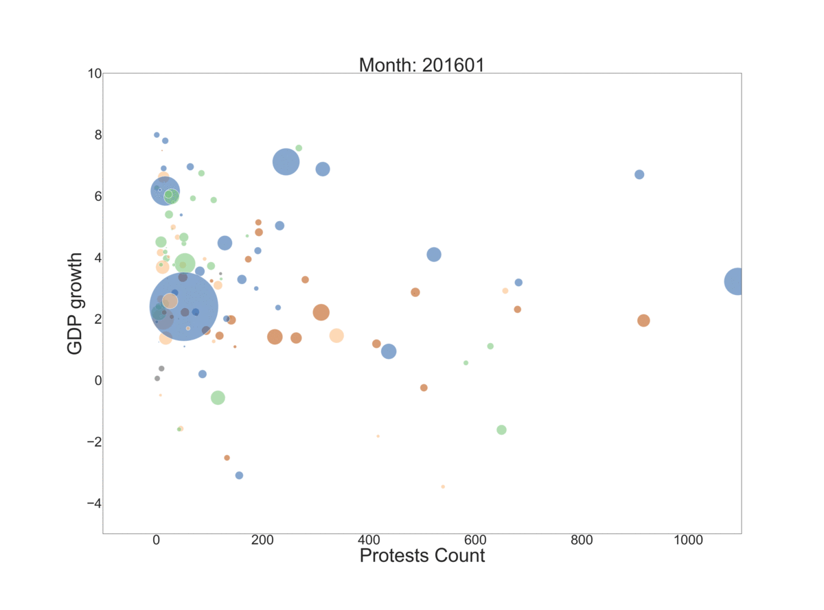 We should also realize that a significant proportion of protest is nearly impossible to predict. We might identify situations where protests have a higher risk to occur. We found that the GDP growth is clearly inversely proportional to the number of protests. However, this is a general data on the year long and we cannot capture the burst of protest.