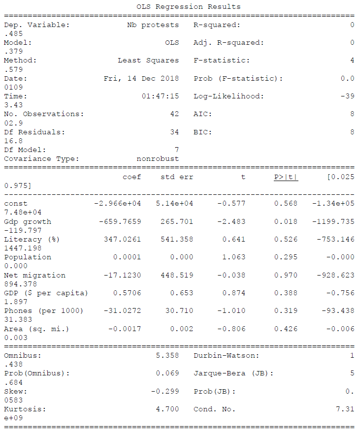 We see that only the constant term, the population and the gdp growth have a p value smaller that 0.05. These values are making sense. It seems evident that with a larger population the number of protest will be more important. And poor economic result may push more people to demonstrate to protect their standard of living. It is also interesting to see that the GDP per capita is not significant. It seems that people care more about the improvement or degradation of their condition that about their current condition.