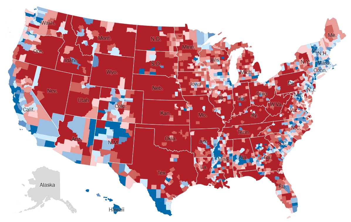 between 11/06 and 11/05 2016. The red circle shows the location and the protest count in a same region. Higher is the protests’ count, larger is the circle. The density of protest is much more import in big cities: Chicago , New York, Los angles, Washington, San Francisco, Miami , Seattle and Portland. We want to compare these protest location with the result map of the US elections of 2016.