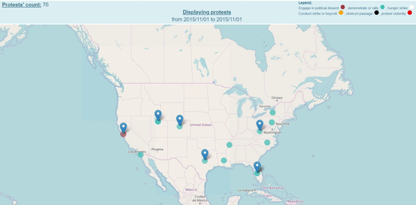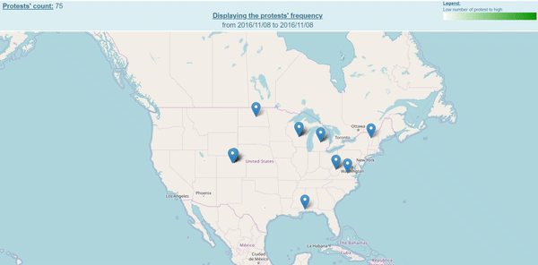 The color of each point (protest) starts white, each time a new protest goes to the same location, the point becomes darker. We choose green as intermediate color.