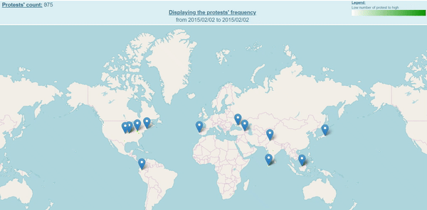 After few seconds, we can visualize the frequency of the protests. More darker is the circle, more the frequency is high. If we compare both maps, we can conclude that even though the Europe’s protests are more violent, they are less frequent.